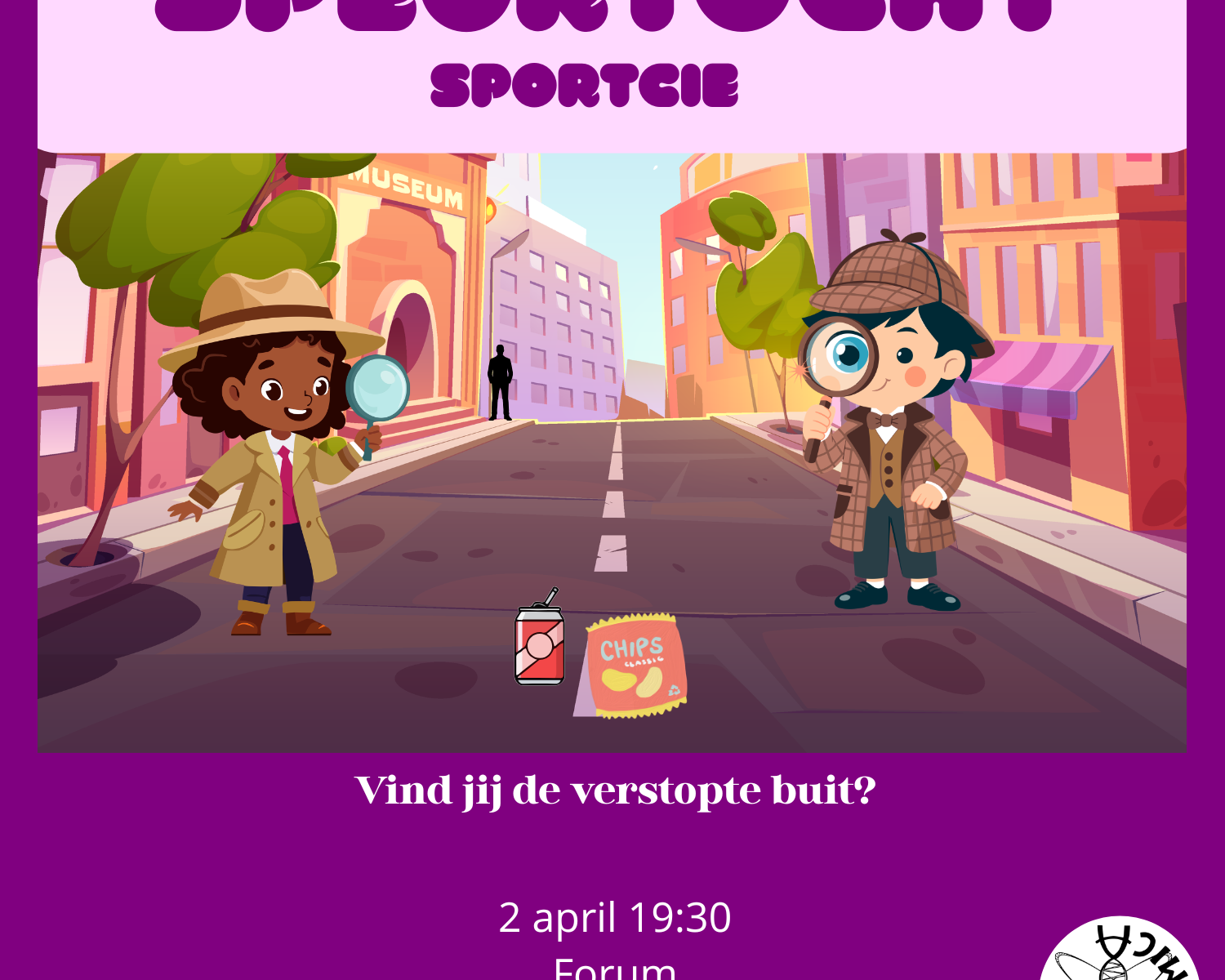 We verzamelen om 19:30 uur bij de boom voor Forum. Of je nu een geboren spoorzoeker bent of gewoon zin hebt in een avond vol actie: schrijf je in en zorg dat je erbij bent!