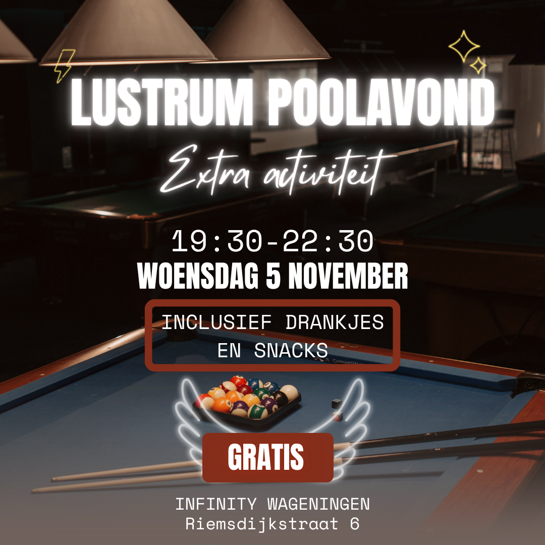 Hey allemaal, hebben jullie ons gemist?? Als LustrumCie organiseren we nog één laatste activiteit🎉 Op woensdag 5 november gaan we van 19:30 tot 22:30 poolen bij Infinity🤩 Tijdens deze avond kun je gezellig poolen onder het genot van een drankje en snacks! De activiteit is helemaal GRATIS en toegankelijk voor iedereen, dus ook als je …